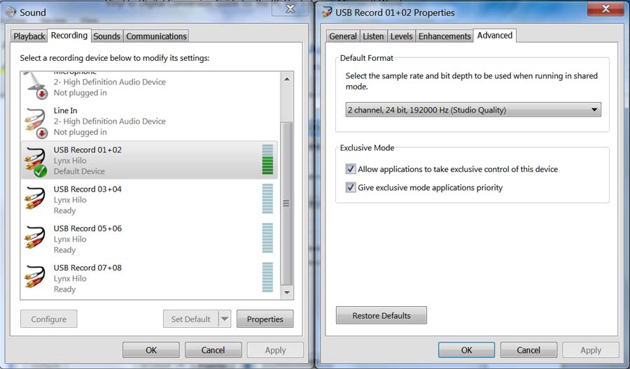 Такую же процедуру следует выполнить и на вкладке Recording запись, см. ниже):