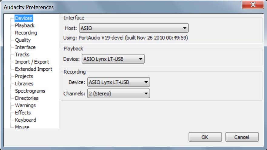 Audacity (Edit (редактировать) -> Preferences (предпочтения) -> Devices (устройства)):